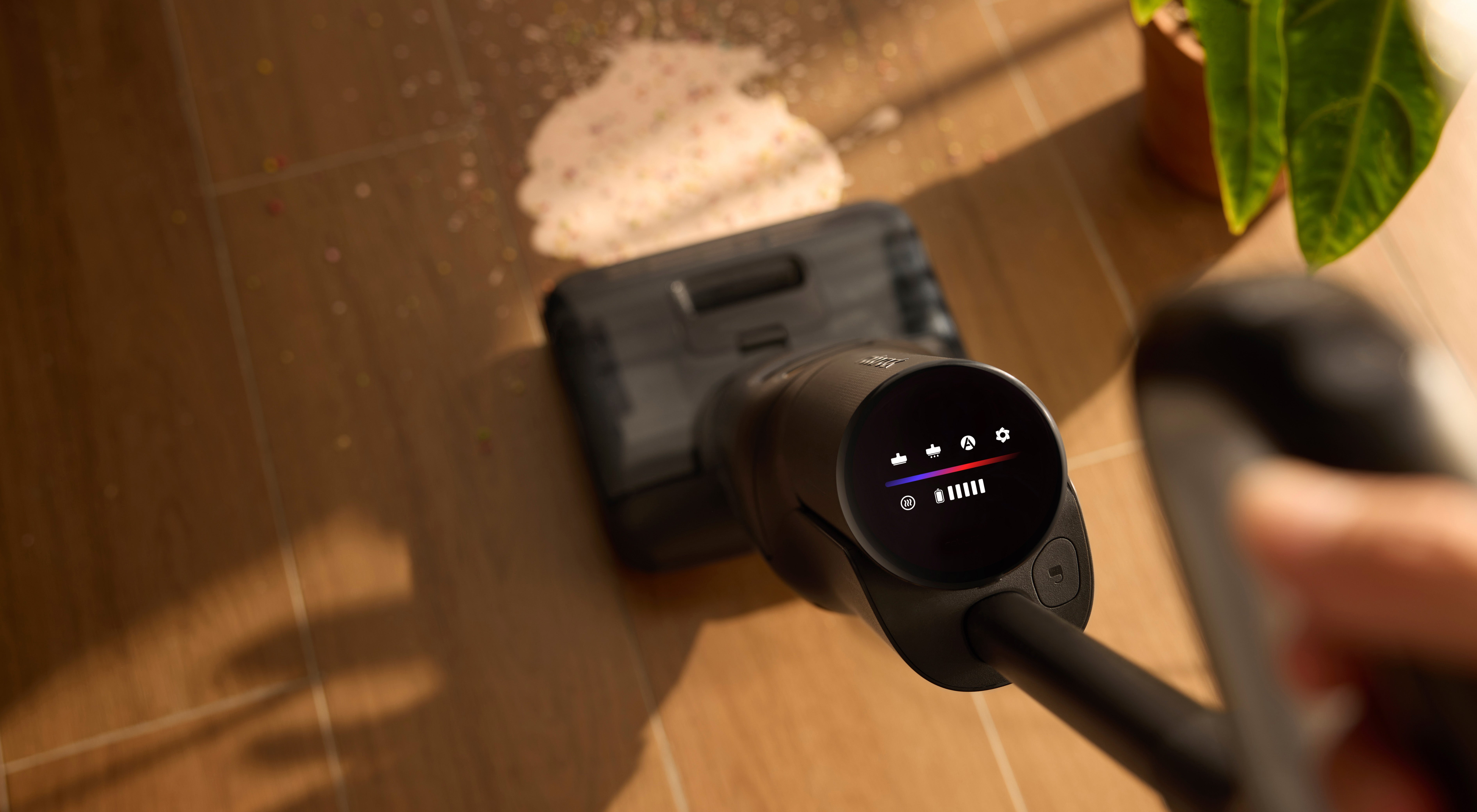 直立状態で自立しているときも電源が切れないので、敷居を越えたり、階段などの狭い場所を掃除するのに最適です。電源オフや再起動の必要がなく、途切れることなくスムーズに掃除できます。
