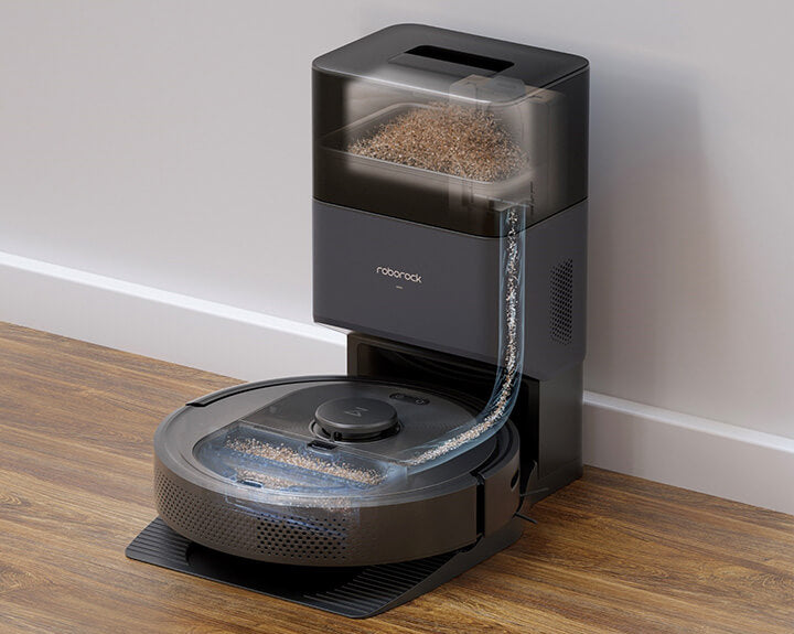 掃除完了後、本体のダストボックスに溜まったゴミを自動で吸い上げ、ゴミを捨てる手間を減らします。