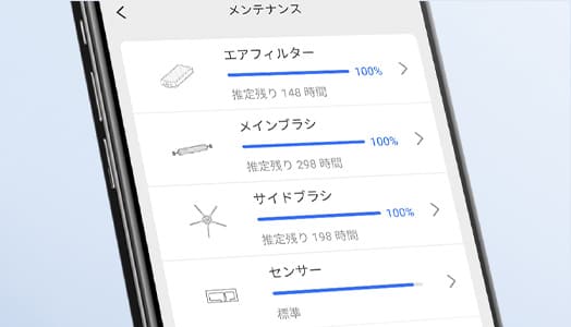アプリでお知らせ。アプリの画面から、エアーフィルター、サイドブラシ、