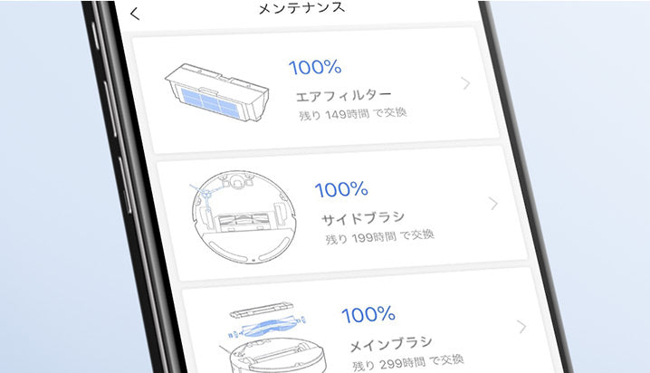 アプリでお知らせ。アプリの画面から、エアーフィルター、サイドブラシ、