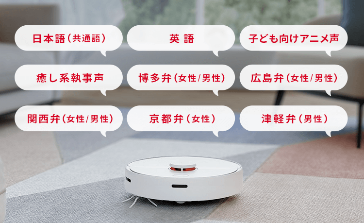 掃除のひとときに温かさや親しみを持っていただけるよう、地域方言、執事の声など豊富な音声案内のバリエーションをご用意しました。アプリからいつでもお好きに選択できます。
