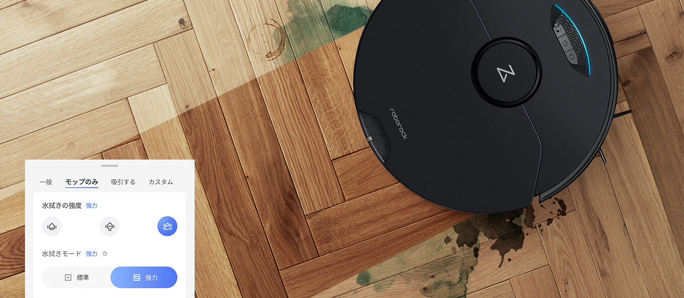 水拭きモードは、強力(3,000回/分)、標準(2,300回/分)、ソフト(1,650回/分)から選べます。600gの高加重モップと相まって、皮脂、花粉、コーヒーなどのしつこい汚れを強力に拭き取ります。