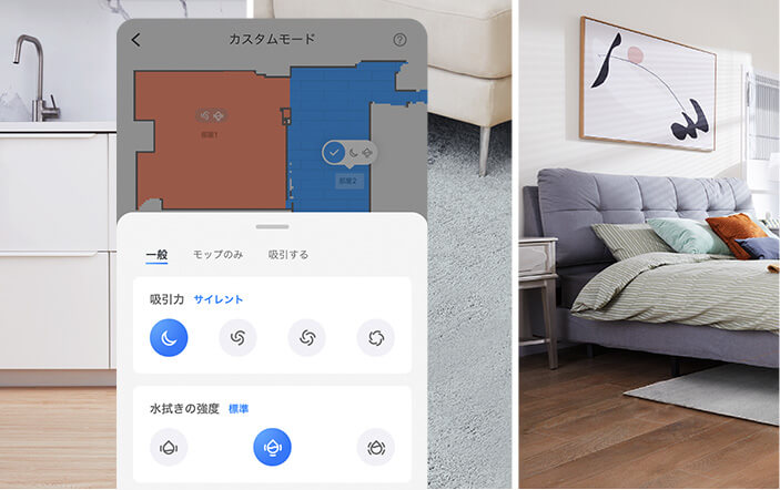 床や家具から部屋を予測し、最適な吸引力や水拭き強度、掃除順を提案します。 お好みで部屋ごとに各種の設定をすることもできます。