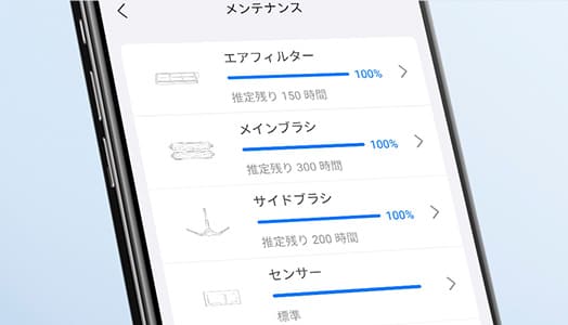 アプリでお知らせ。アプリの画面から、エアフィルター、サイドブラシ、