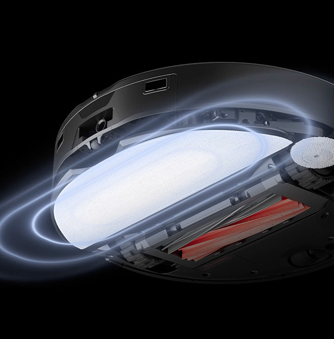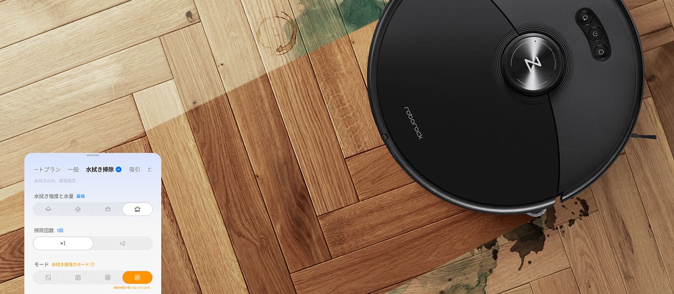 吸引力を停止し、毎秒20cmのゆっくりとした速さでより丁寧に水拭きに専念する「水拭き超強力モード」を搭載。水拭きモップを高速振動させながら、よりきめ細かなルートを走行し、床のベタつきなどもさっぱりと拭き上げます。