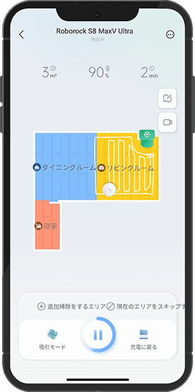 「お急ぎ掃除モード」を選択すると、通常ルートの掃除より30%速く掃除を完了します。また、「クイックマッピング」は、掃除しながらマッピングする従来の方式と比較して、最大6倍の速さで各部屋のマッピングを行います。お急ぎの掃除もRoborockにお任せください。