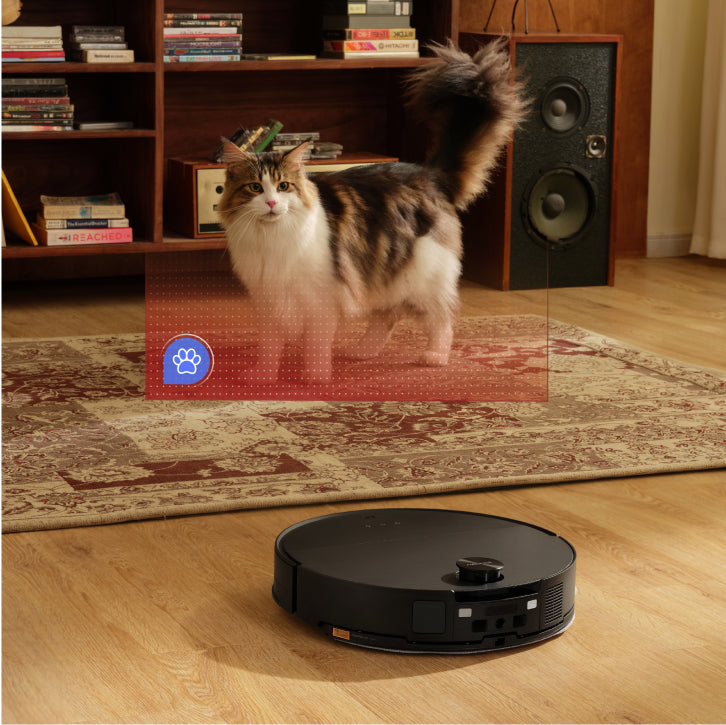 掃除中、ペットに近づくと即座にメインブラシを停止。離れた場所に移動してペットを驚かせないようにします。